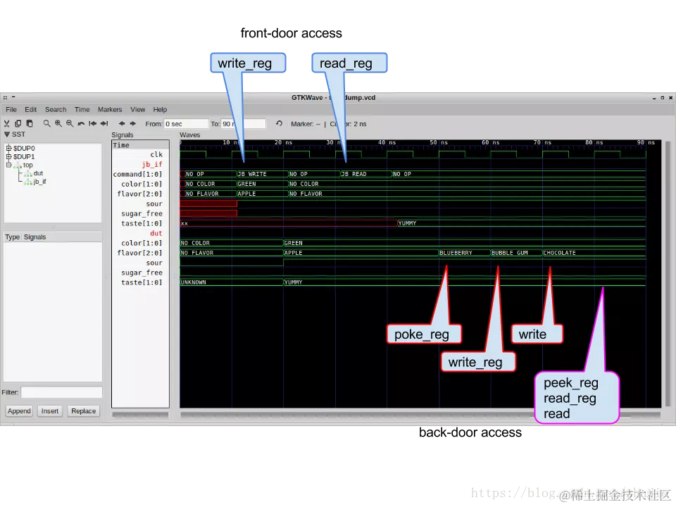 这是一个带注释的波形。前门访问使用jb_if,而后门访问则直接更新DUT的寄存器值。请注意,即使DUT应该对YUCKY响应酸味和巧克力的组合,后门仍然不会更新DUT的taste字段。这是因为DUT会响应jb_if上的值更新taste字段,但不会响应内部RECIPE寄存器值。