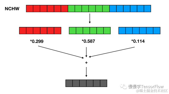 如果我们需要对图像做彩色转灰度计算,NCHW 计算过程如下: