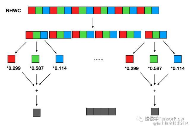 相应地,NHWC 数据格式的彩色转灰度计算过程如下: