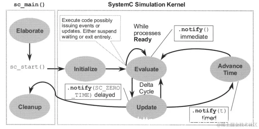 以下简化的流程图说明了SystemC仿真内核的操作流程。