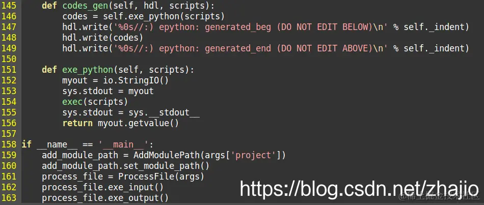 4. processFile 类,读取要处理的文件,并根据内嵌python脚本的关键字,匹配出python脚本并存放在scripts变量中,第一行Python脚本中的第一个锚定正则表达式会被视为将要生成的输出的缩进。当遇到普通文件行的时候,则内容连续内嵌python脚本结束,117行调用codes_gen执行python并获得输出。