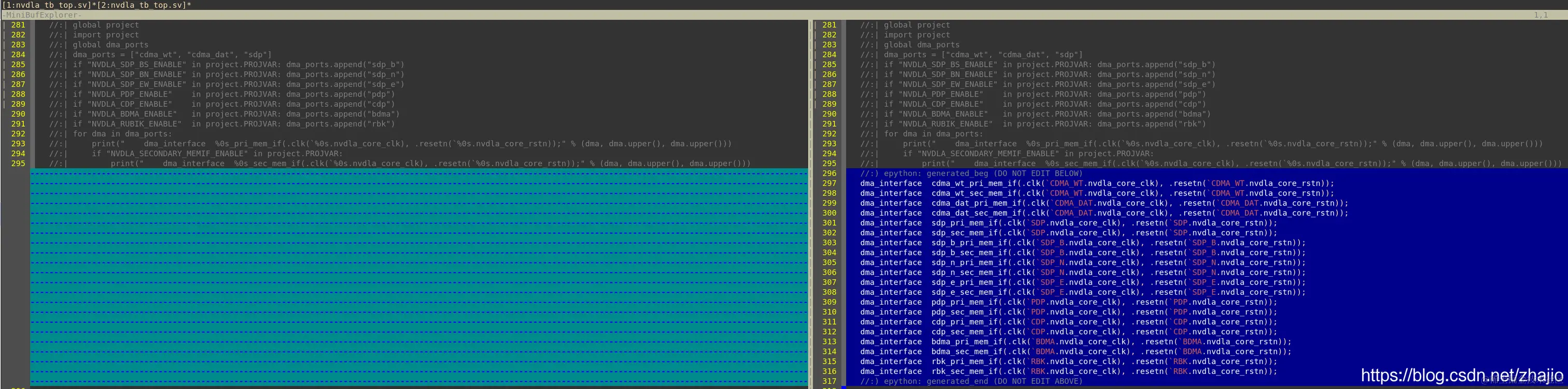 5.接下来,执行内嵌Python脚本,并为输出文本添加文件头和尾。之所以加入此关键字,也是为了如果重复执行python脚本,不会再次生成输出并嵌入verilog文件中,上图中110行gen_flag即为控制knob。