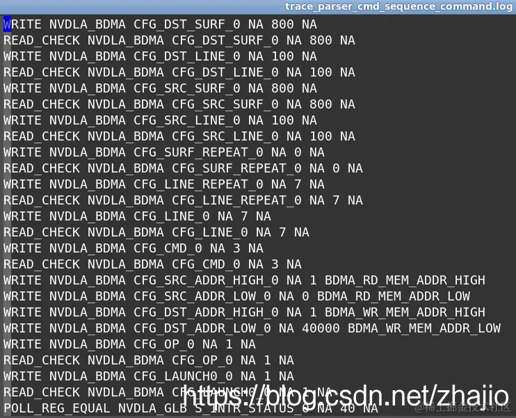 trace format 文件,在trace_player tb中经过nvdla_trace_parser.py脚本处理,会生成四个文件,四个文件分别对应四类不同的cfg cmds。