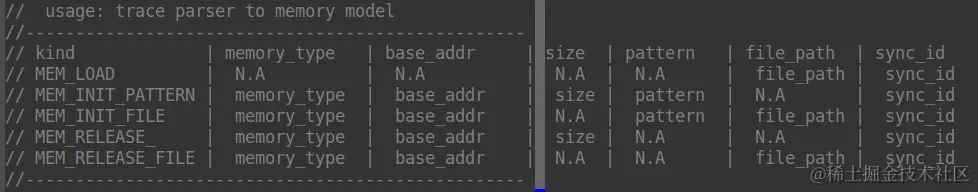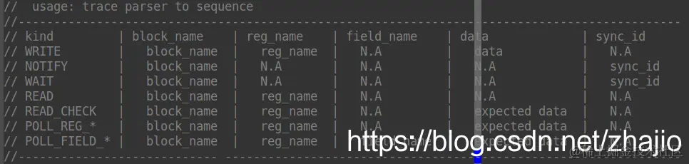 end_of_elaboration_phase中调用parse_trace函数,生成四种cmd file生成,然后分别读取其中内容,因为四种cmds每个字段的含义有些不同,请参考下图: