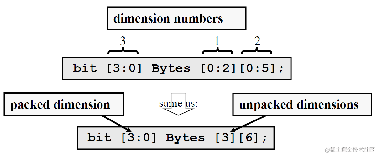 非压缩数组可以由任何数据类型组成。每个固定大小的维度应由地址范围(例如[1:1024])或单个正数来表示,以指定固定大小的非压缩数组的大小,如C中所示。换句话说,[size]变为与[0:size-1]相同。