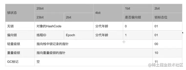 其中对象头的 MarkWord 共 32 bit ,包含了锁的状态信息,可见 Mark Word 中包含了四种锁状态: