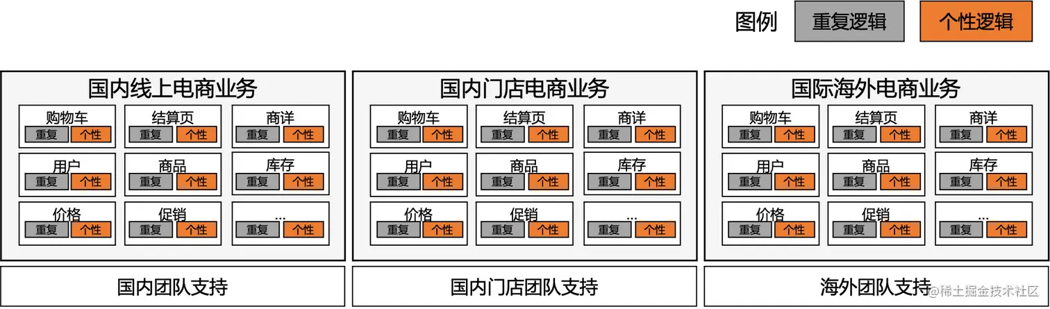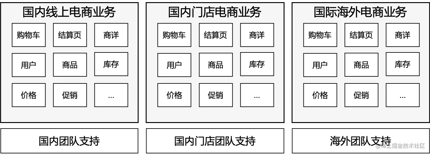 烟囱式开发顾名思义,如下图每个部门独立开发,不同部门就像是一个个独立的烟囱,独立冒烟(开发),互不耦合。好处显而易见:每个业务部门都有专门的技术团队进行开发,不需要跨部门协作,新需求可以快速迭代开发上线,迅速占领市场。(下图是个电商示例:一个电商平台存在国内线上业务,国内门店业务,以及国外业务,为了国内和海外业务需求互不影响,不同业务有不同的开发团队:)