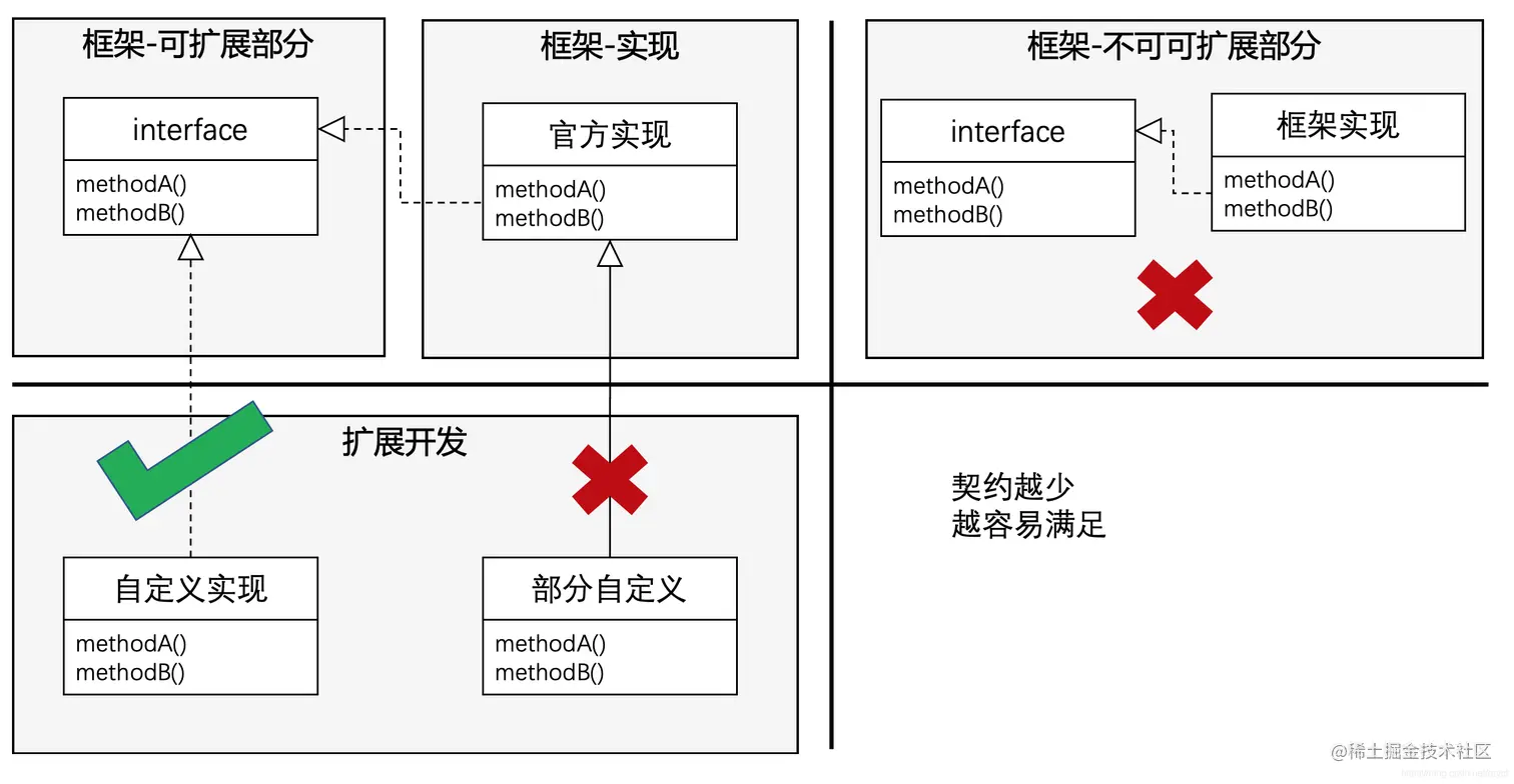 如上图:平台代码分离开「可扩展部分」和「不可扩展部分」。「不可扩展部分」伴随框架升级可以随便修改(第三方扩展开发无感知) ;「可扩展部分」尽量稳定提供历史接口兼容,第三方扩展开发不会受到影响 。在保护第三方扩展开发的资产和框架自身的可持续升级之间取得平衡。 「可扩展部分的接口」既「SPI」第三方可以扩展,官方也可以提供实现了这些接口的「官方组件」,第三方可以直接使用官方组件。