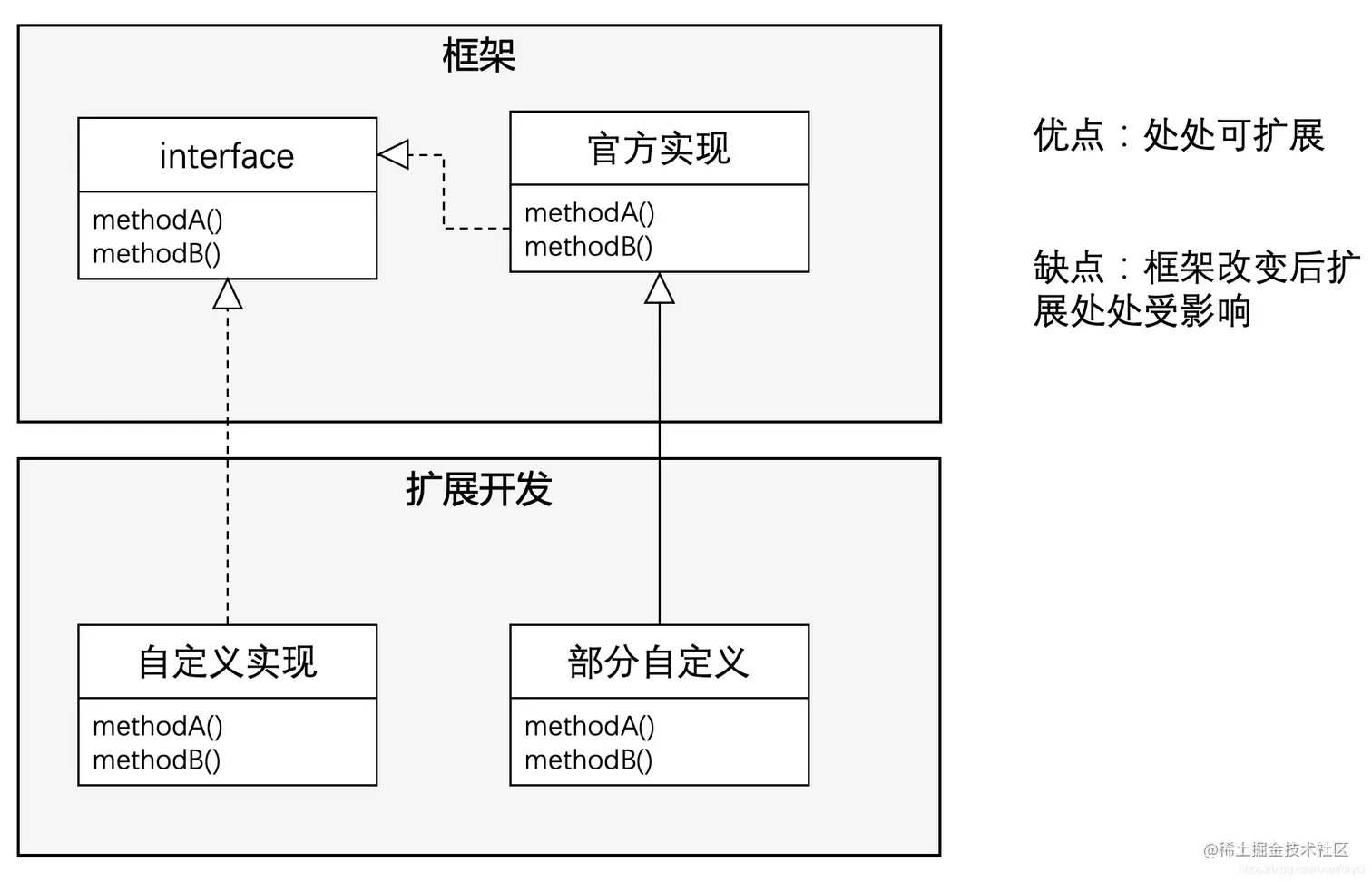 - 程序其他部分外部不可进行直接扩展二次开发,程序可以根据自身诉求进行迭代,可以进行面向对象的更好维护的设计。