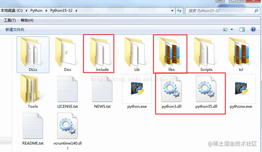 在路径C:\Python\Python35-32中有include和libs,里面分别是头文件和lib文件,在根目录下有dll文件。