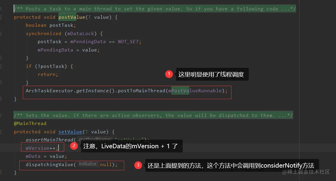 再来来看一下,postValue在切换到主线程中都干了些啥,我们发现他的Runnable中的方法,最终还是执行了setValue。