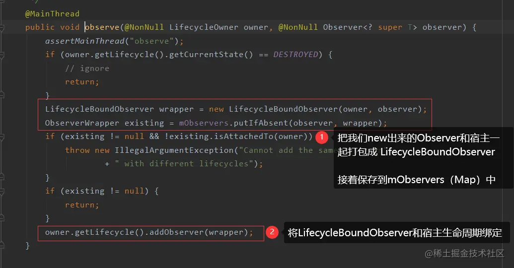 * 将传入的observer包装成LifecycleBoundObserver(继承ObserverWrapper)会将传入的observer做保存和保存在hashMap