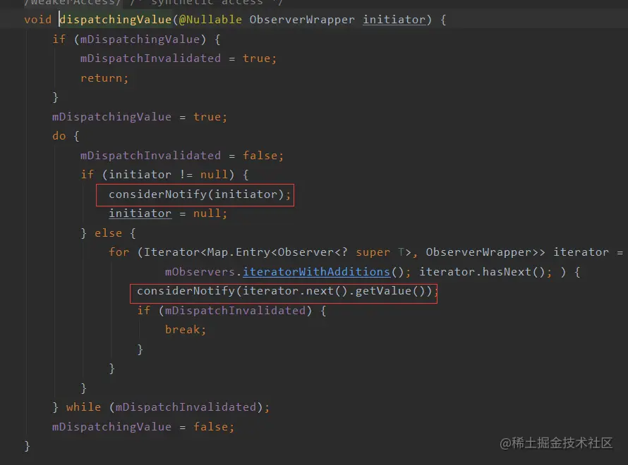 可以看到dispatchingValue不管走哪边都会进入considerNotify