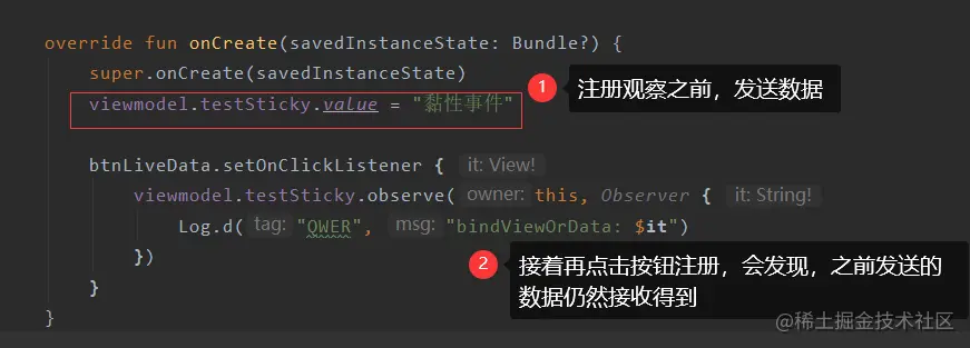 // LiveDataBus.with<String>("TestLiveDataBus") .observerSticky(this, false) {