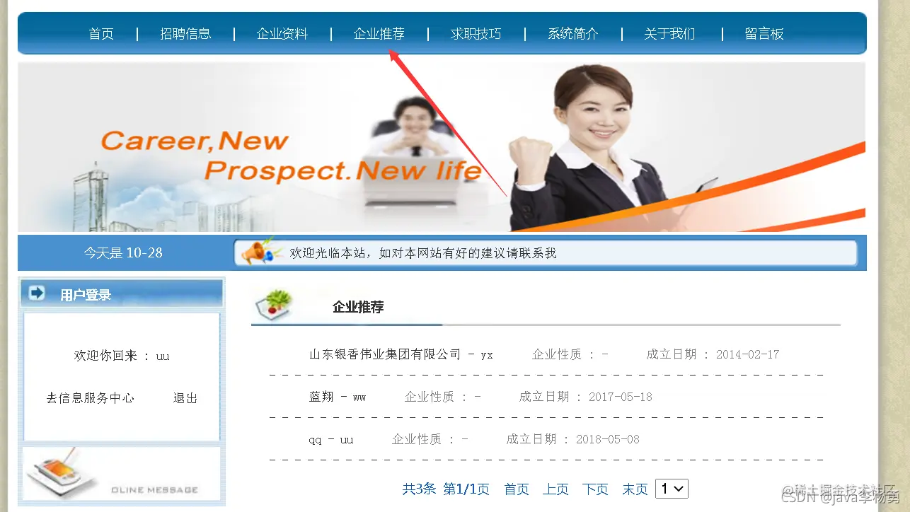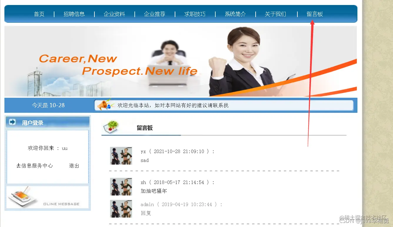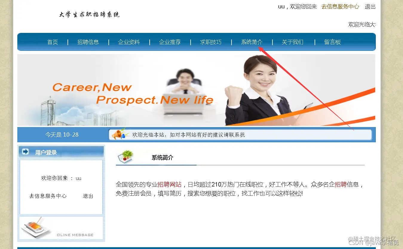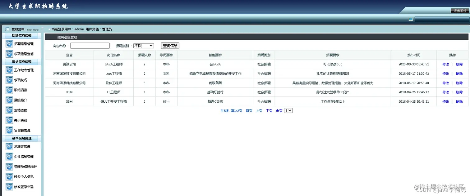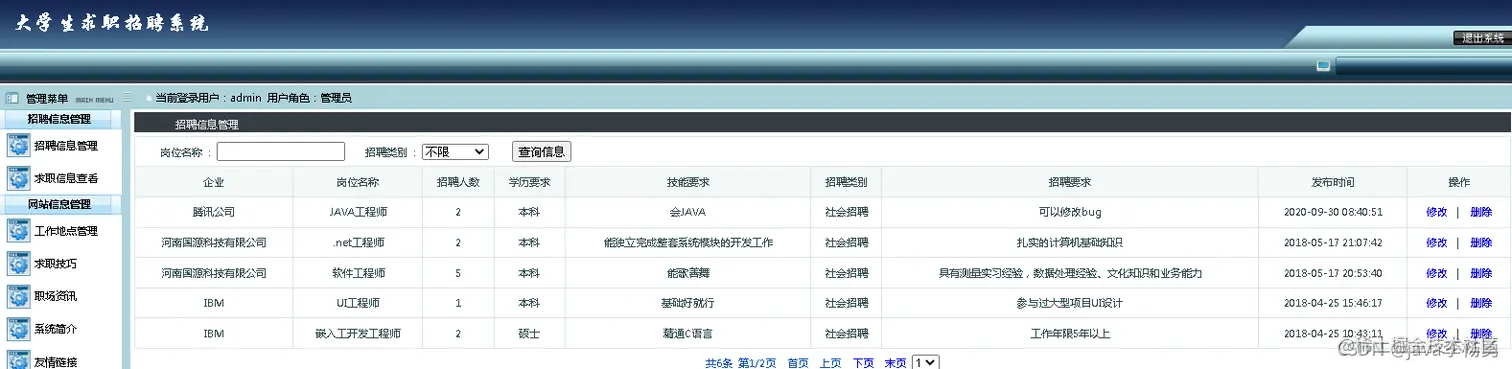 临近学期结束,还是毕业设计,你还在做java期末作业、程序网络编程,不知道毕业设计该怎么办?老师的作业要求觉得大了吗?没有合适的类型或系统?网页功能的数量是否太多?等等。这里,你想解决的问题,在这里都能满足你的需求。原始Jsp、SSM、SpringBoot、以及HTML+CSS+JS页面设计, web大学生网页设计作业源码等等都可以参考得到解决。话不多说直接拿一个学生求职招聘管理系统来举例