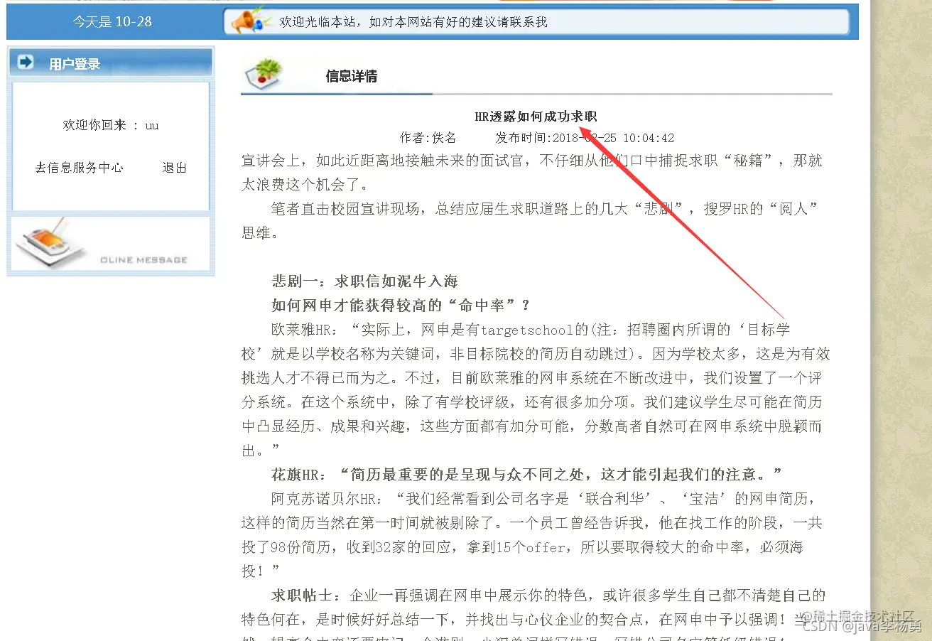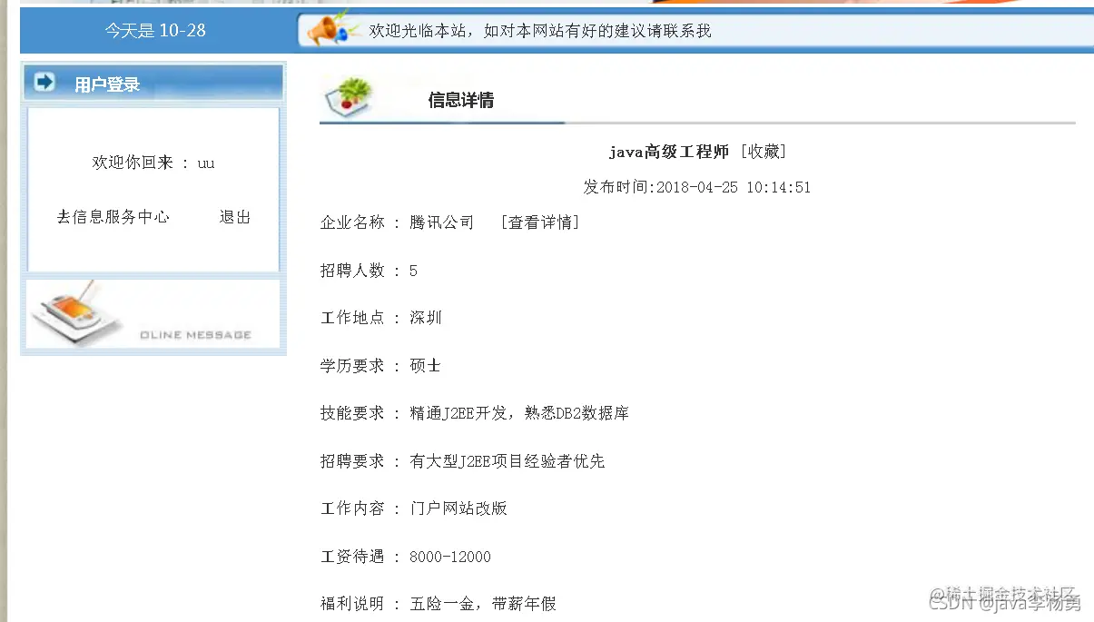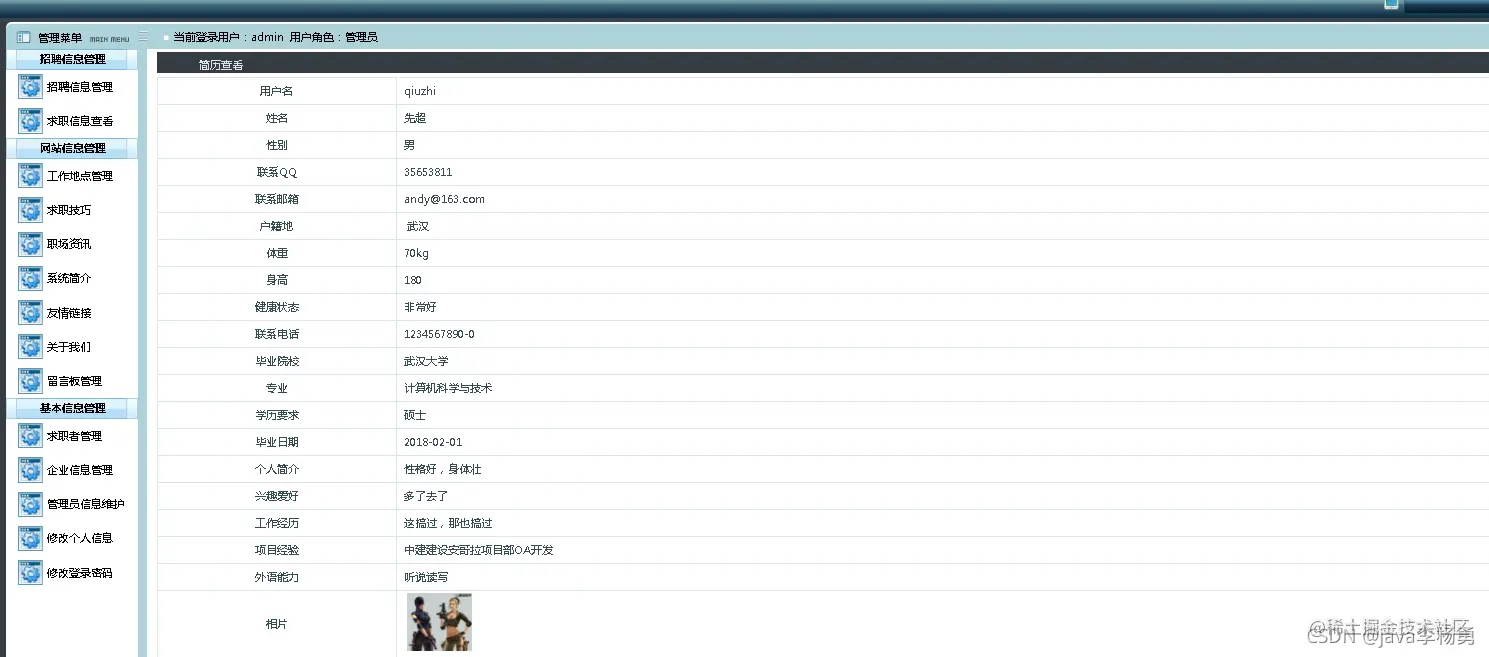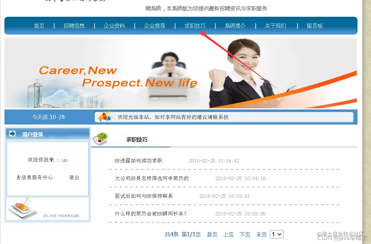 临近学期结束,还是毕业设计,你还在做java期末作业、程序网络编程,不知道毕业设计该怎么办?老师的作业要求觉得大了吗?没有合适的类型或系统?网页功能的数量是否太多?等等。这里,你想解决的问题,在这里都能满足你的需求。原始Jsp、SSM、SpringBoot、以及HTML+CSS+JS页面设计, web大学生网页设计作业源码等等都可以参考得到解决。话不多说直接拿一个学生求职招聘管理系统来举例