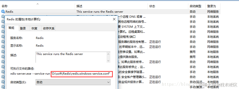 Windows的Redis启动服务默认加载的配置文件是redis.windows-service.conf,如下图所示: