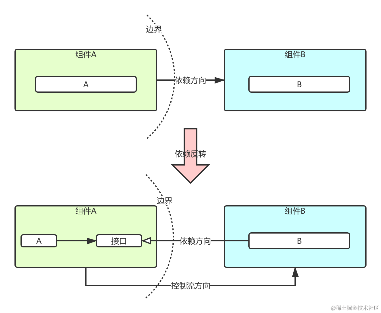 依赖反转原则是个可操作性非常强的原则,当你要修改组件间的依赖方向时,将需要进行组件间通信的类抽象为接口,接口放在边界的哪边,依赖就指向哪边。