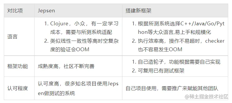 测试有效性主要靠框架丰富的测试功能保证的,而编写难度直接影响着项目效率和规模化。直接使用开源框架Jepsen,则是看重它已有功能完备,认可度高。搭建新框架,则测试上手简单、编写case易规模化,同时根据语言特性可以更适合某些测试场景(如解决OOM、直接复用已有测试框架的代码)。
