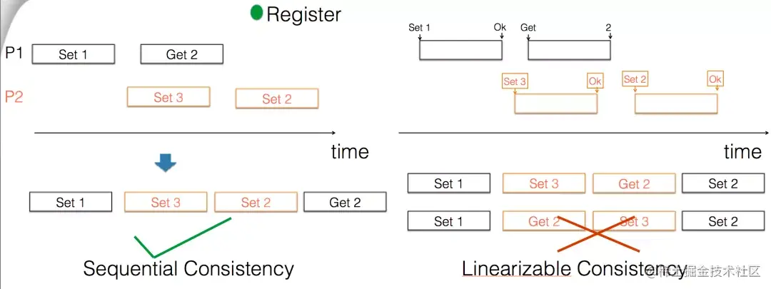之前提到的文章已经对线性一致性提供很详尽的论文资料和直观说明,大家可以研究一下。文章里给出了顺序一致性和线性一致性直观的例子: