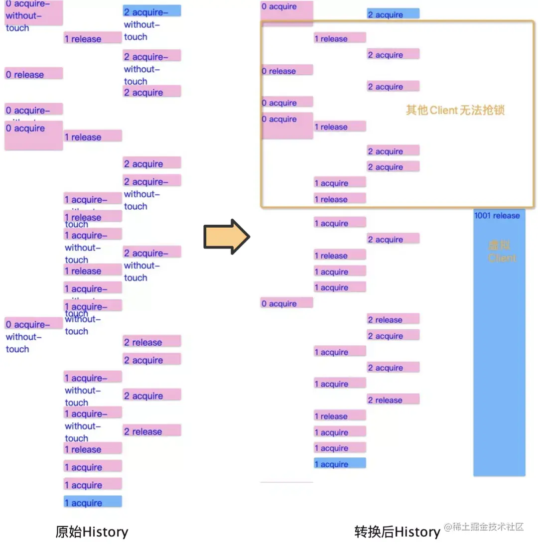 Checker部分则是验证锁可用性的关键,我们想验证的是当lease过期之前,即touch-lease的间隔时间内,锁不会被抢到,在timeout时间——lease-ttl后则可以被抢到。于是我们根据已有的History,虚拟出一个Client,它的开始时间会在一个release-lease操作的lease-ttl时间后,进行一个release操作,如果过程中锁又被抢到或者被另一个Client自己释放,则在History中取消这个虚拟Client的操作。由此我们可以继续使用线性一致性Checker对Mutex Model的验证,来证明锁的可用性——在锁心跳过期之前不会被其他Client抢到,锁lease-ttl结束之后可以被抢到。由于我们锁的释放时间是一个动态范围,所以将Release的起始和结束时间间隔加上这个动态范围,实际的转换效果如下图。