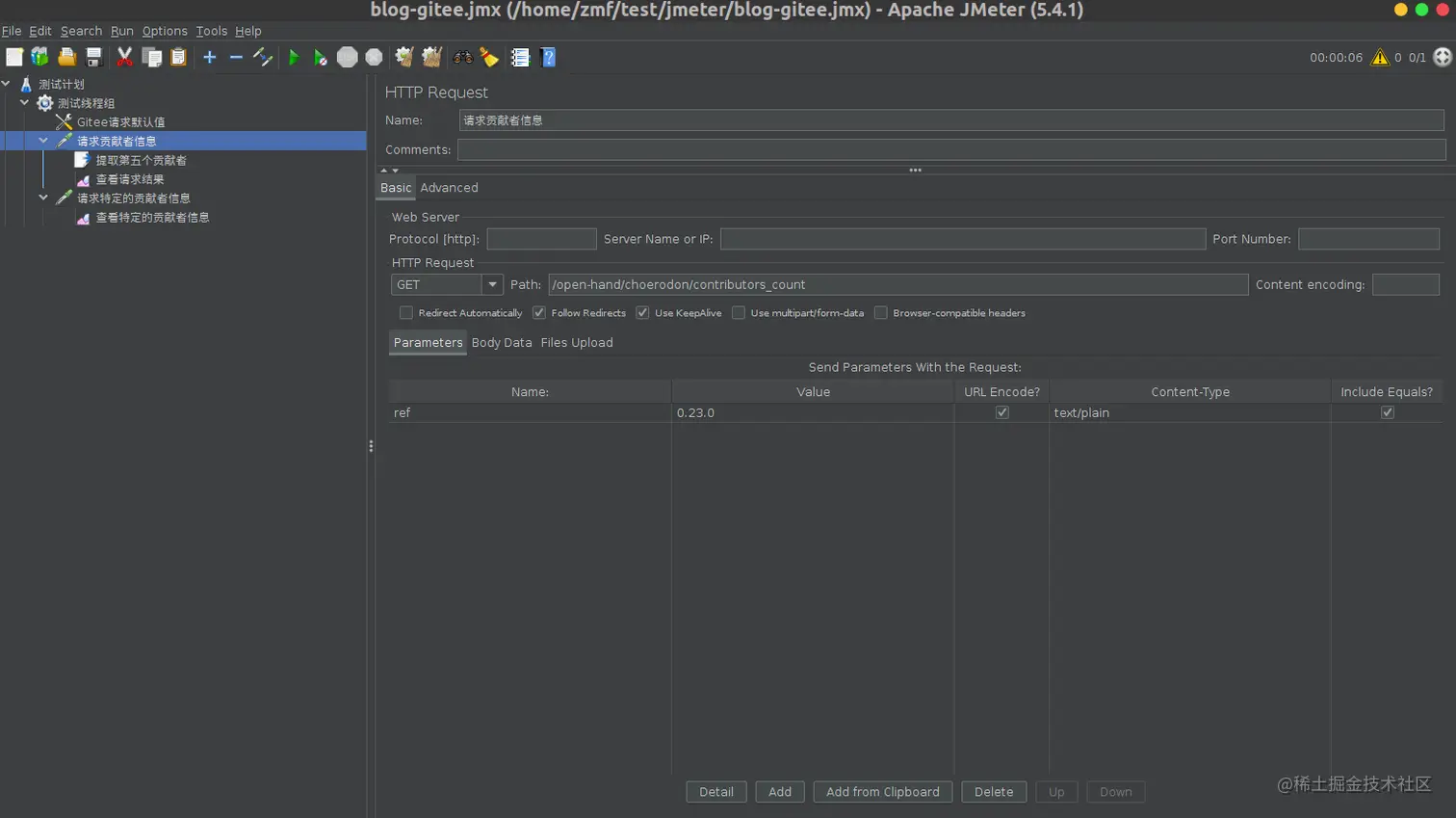 右键单击线程组,Add > Sampler > HTTP Request 添加采样器(这里在 path 属性填入 ${contributorName} 用于引用上一个请求提取出的变量):