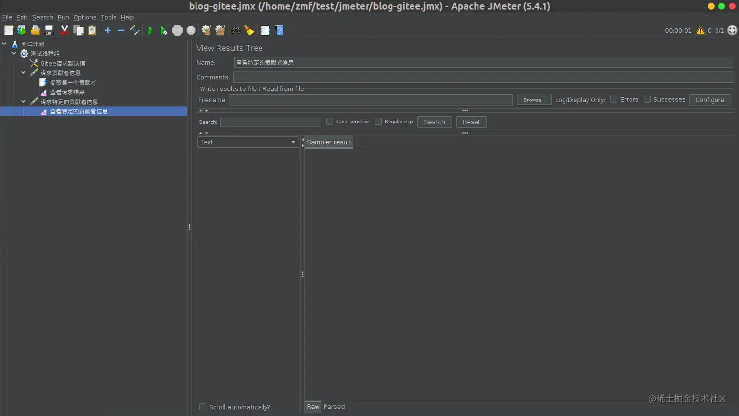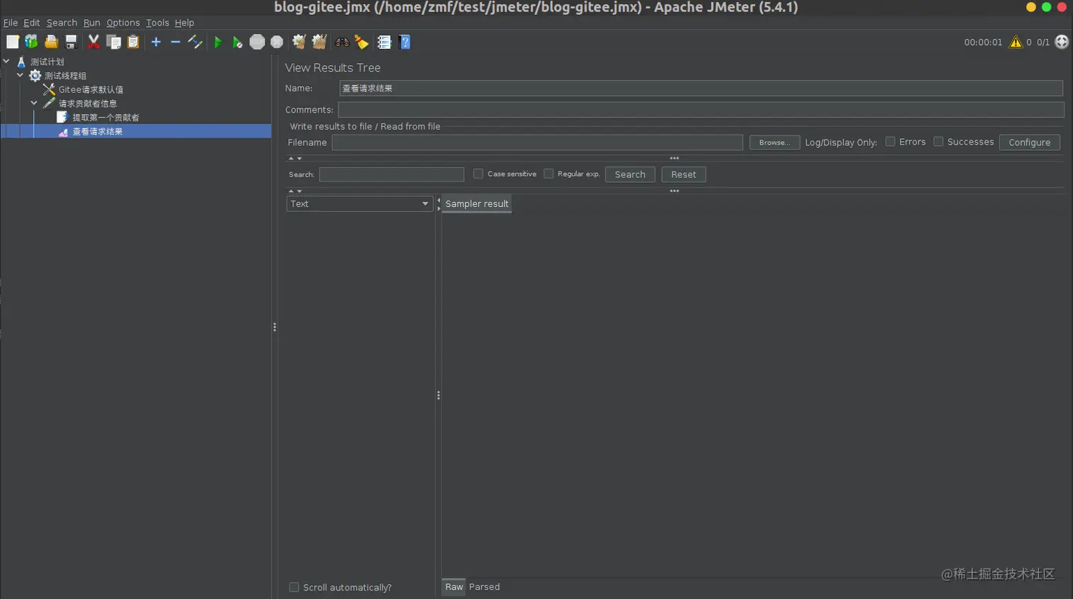 点击第一个请求的 查看结果树 元素可以查看这个请求的执行结果: