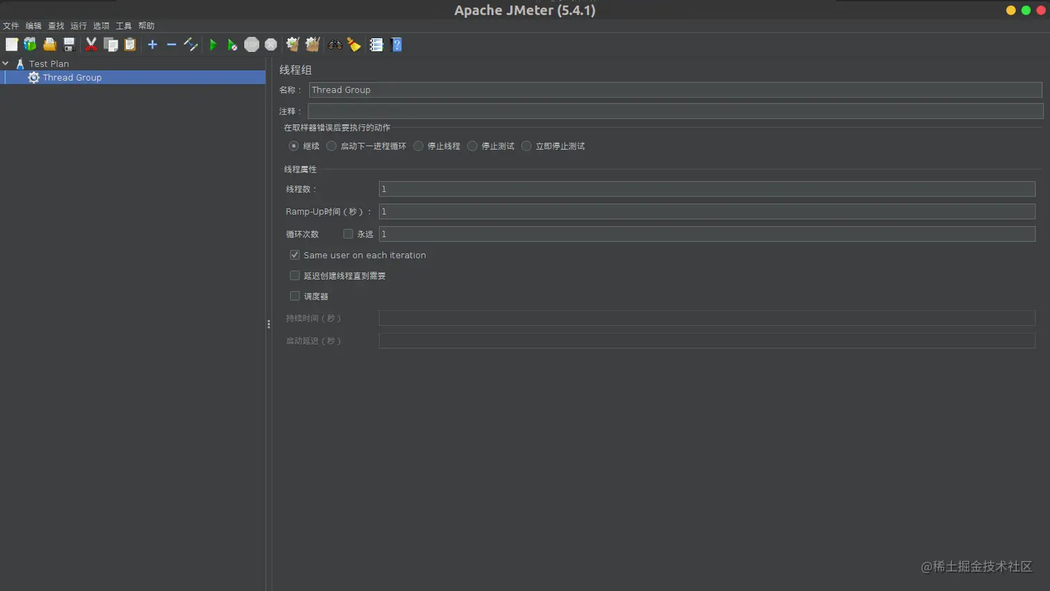 | 错误后的动作 | 继续(继续执行之后的步骤)、启动下一循环、停止线程(仅此线程)、停止测试(等正在执行的采样器执行结束后停止测试)、立即停止测试 |