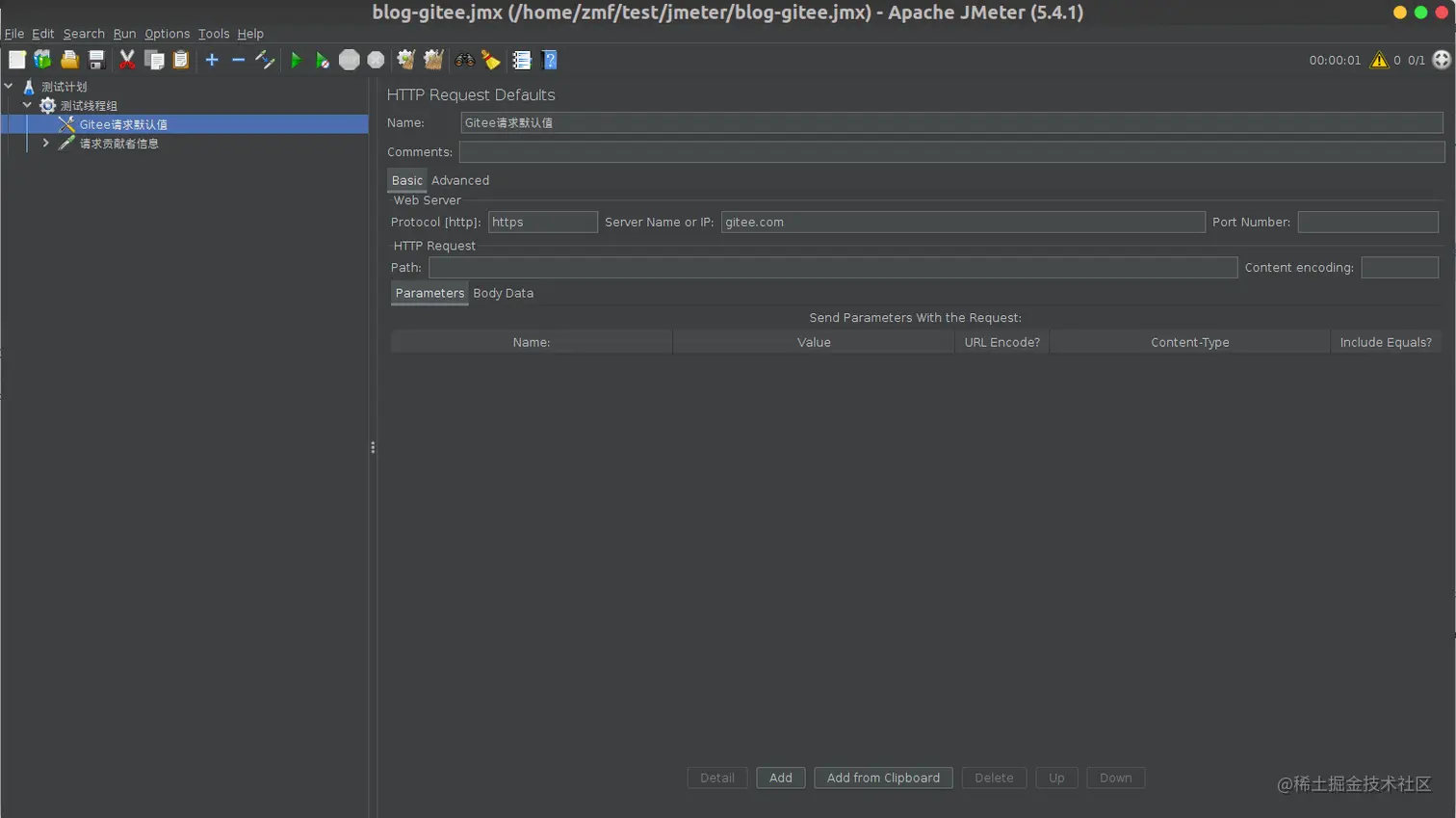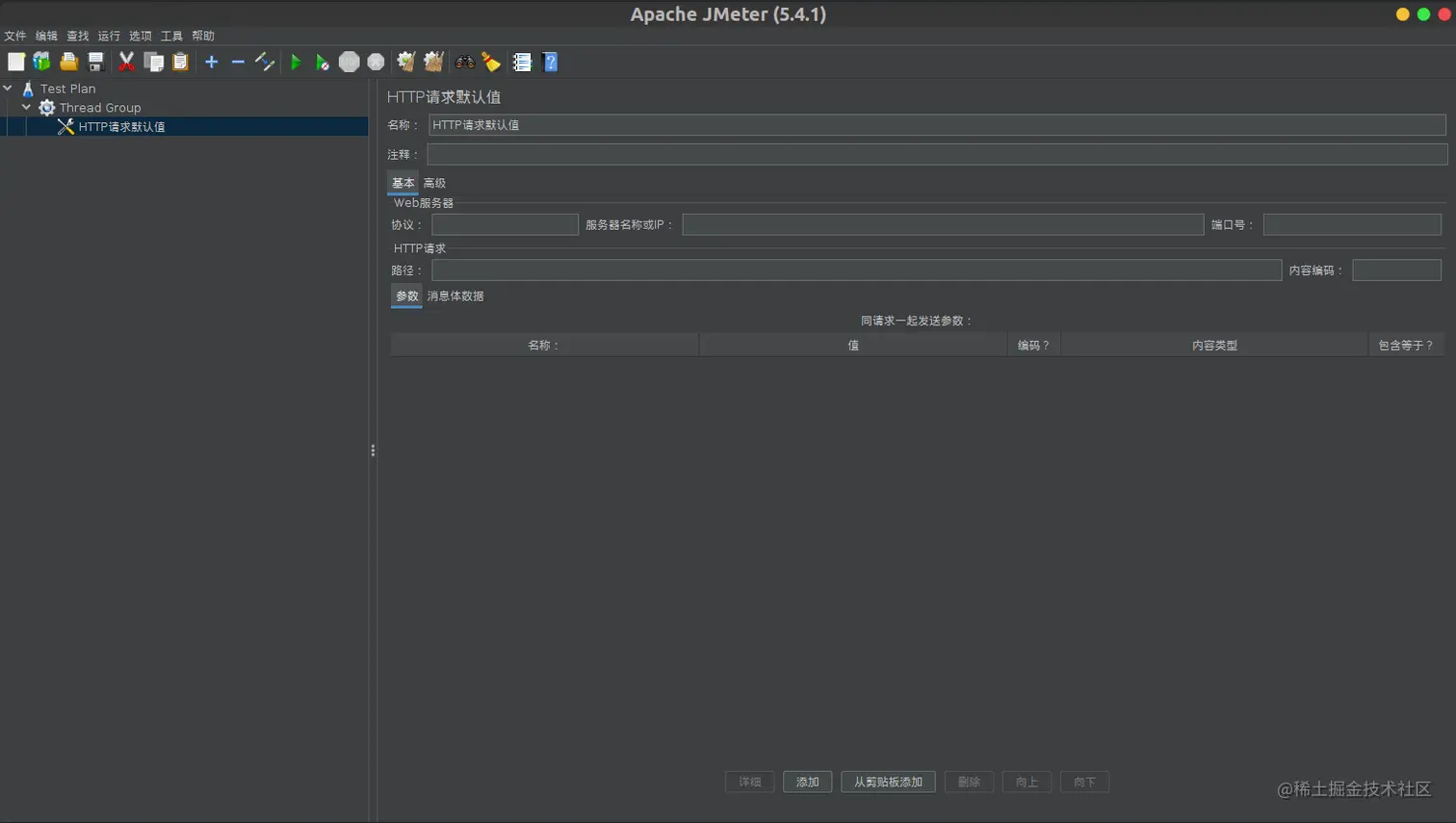鼠标右键单击线程组,Add > Config Element > Http Request Defaults 添加配置元素。填入值如下:
