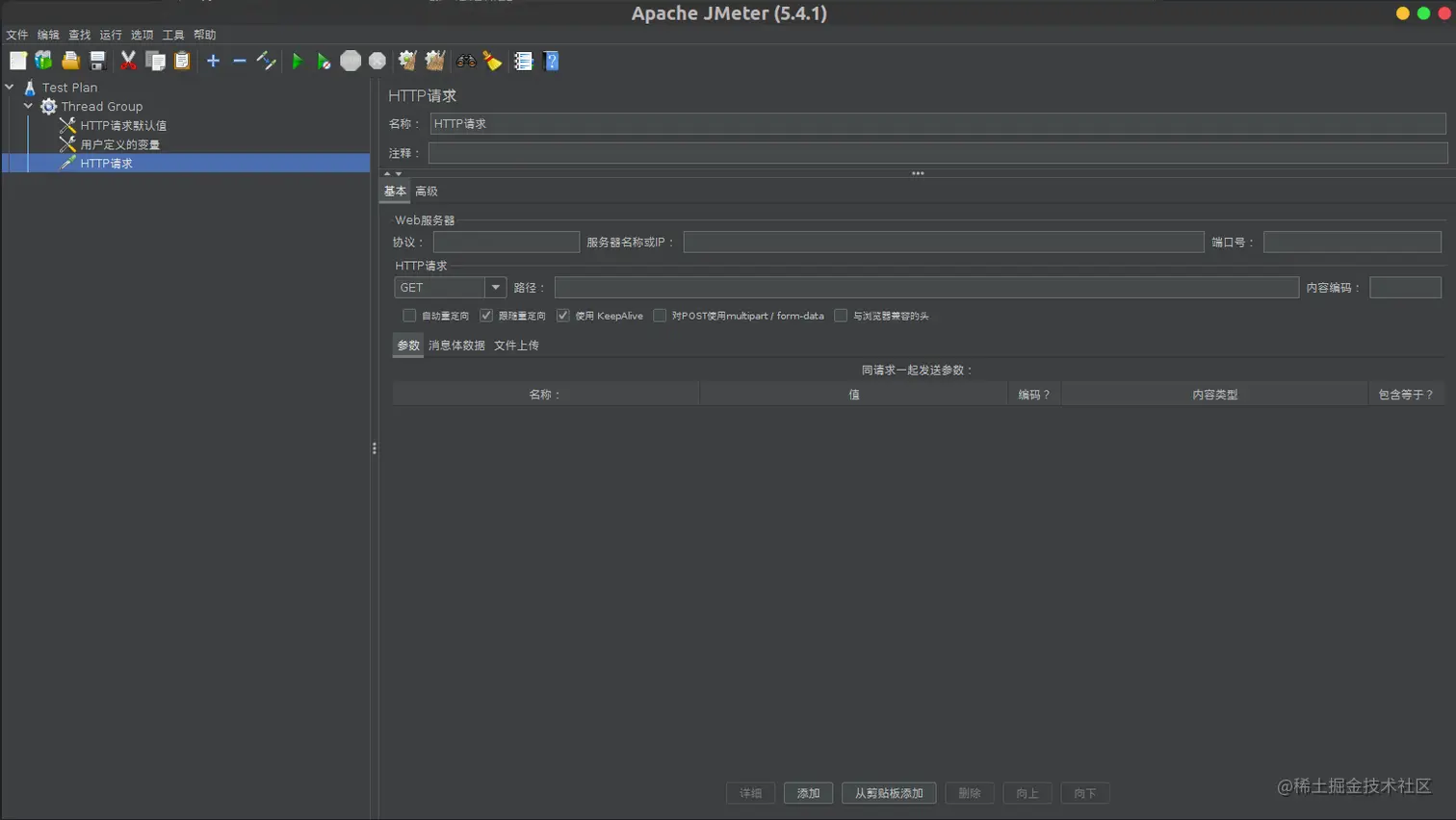 HTTP采样器可以使用 HTTP 请求的形式对被测系统进行采样(发起请求)。这个组件中很多数据和上文提到的 HTTP请求默认值 组件中的很多属性相同,如果此采样器在 HTTP请求默认值 组件作用范围内,则采样器中为空的属性会填入默认值,不为空的属性会覆盖 HTTP请求默认值 组件中相同的属性(就近)。