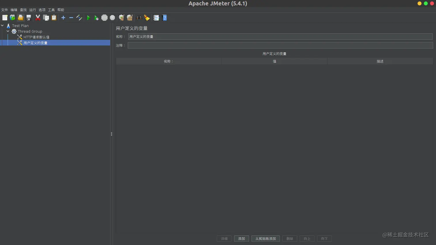 这个组件用于在线程中定义变量,可以在其它地方使用 ${variableName} 的语法进行引用。
