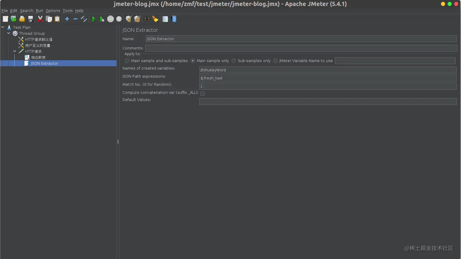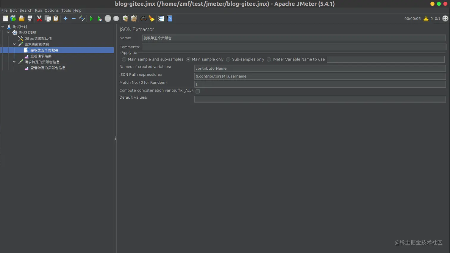 右键单击请求采样器,Add > Post Processors > JSON extractor 添加元素如下,因为某些用户在 gitee 并不存在,这里我们将提取 JSON path 为 $.contributors[4].username (也就是第五个贡献者)的用户名值放入变量 contributorName: