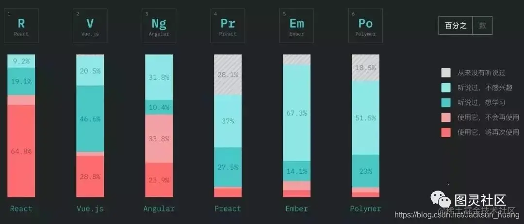 根据《2018 年度JavaScript趋势报告》显示,目前React 在前端领域流行度最高, Vue 排名位居第二,但从“使用过并且将再次使用”的比例来看,Vue和React相比仍有不小差距。