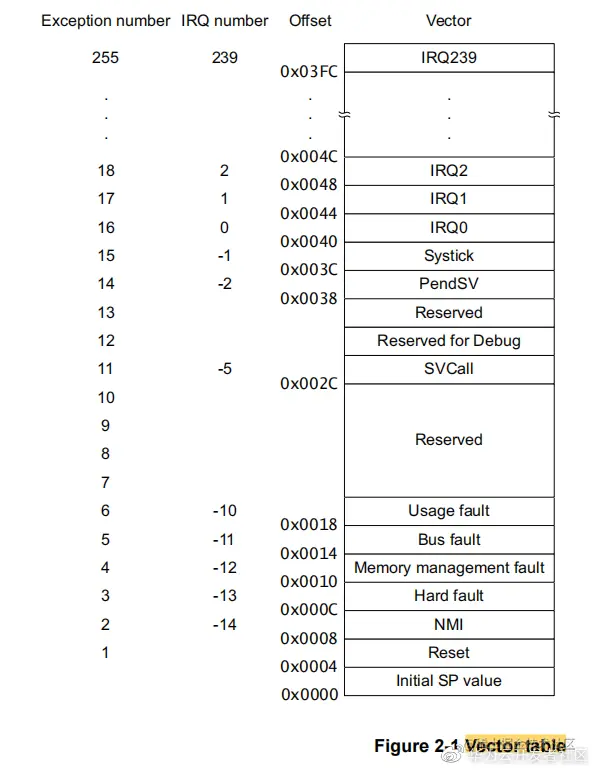 向量表包含栈指针的复位值和开始地址,也叫异常向量。异常可以看作特殊的中断,异常编号Exception number, 中断请求号IRQ number,偏移值offset,向量Vector的对应关系如下图所示,本文主要关注NMI、HardFault、Memorymanagement fault、Bus fault、Usagefault、SVCall等异常。