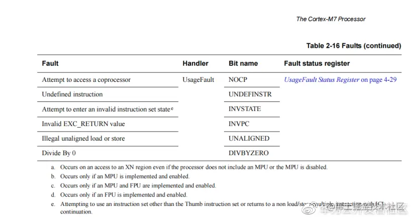 如下图中的Fault类型表格所示,Fault表示各种故障,Handler表示故障处理机制,Bit Name标记故障的寄存器的Bit位,Fault status register故障状态寄存器。该图摘自《Cortex™-M7 Devices Generic User Guide》。