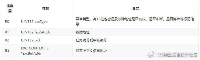 HalExcHandleEntry异常处理函数是汇编异常函数跳转到C语言程序的入口,定义在文件kernel\arch\arm\cortex-m7\gcc\los_interrupt.c,被kernel\arch\arm\cortex-m7\gcc\los_exc.S文件中的汇编函数调用。函数参数由汇编程序中的R0-R3寄存器传值进来,汇编程序中的寄存器和HalExcHandleEntry函数参数对应关系如下表所示:
