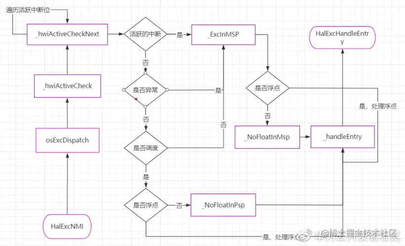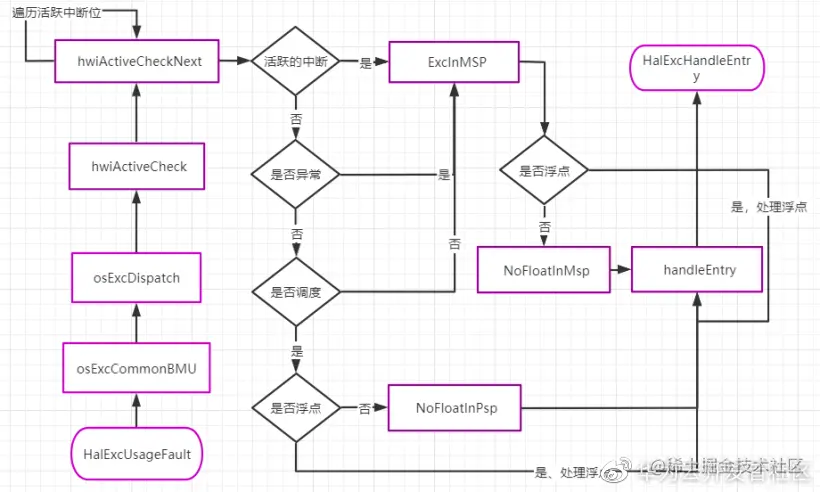 当发生使用异常UsageFault时,会触发运行HalExcUsageFault汇编函数,该函数的执行流程如下图。下文会结合该流程图来阅读函数代码。