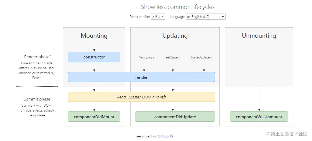 更新:static getDerivedStateFromProps()、shouldComponentUpdate()、render()、getSnapshotBeforeUpdate()、componentDidUpdate()