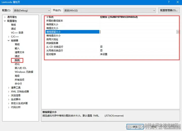 2)空间大小 : 在32位系统下,堆内存可以达到4G的空间(虚拟内存的大小,有面试官问过),从这个角度来看堆内存大小可以很大。但对于栈来说,一般都是有一定的空间大小的(在VC6默认的栈空间大小是1M,也有默认2M的)。可以重新设置,如图: