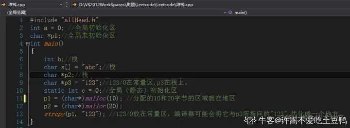 4、文字常量区 ―常量字符串就是放在这里的。 程序结束后由系统释放