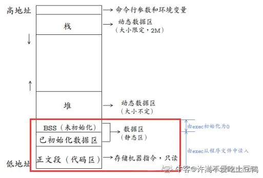 一个程序在内存上由BSS段、data段、text段三个组成的。在没有调入内存前,可执行程序分为代码段、数据区和未初始化数据区三部分。