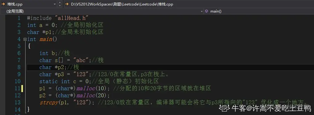 3、全局区(静态区)(static)―,全局变量和静态变量的存储是放在一块的,初始化的全局变量和静态变量在一块区域,未初始化的全局变量和未初始化的静态变量在相邻的另一块区域。程序结束后有系统释放。