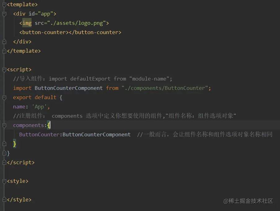 2、注册组件,在App.vue( 或ComponentB)组件中要使用ComponentA,注册ComponentA。(以下代码中,由于App组件在main.js中使用,所以也需要导出)