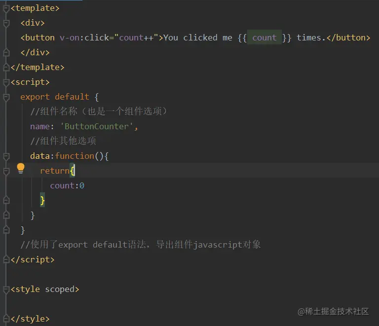 template: '<button v-on:click="count++">You clicked me {{ count }} times.</button>'