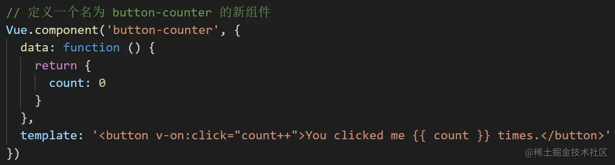 定义一个名为 button-counter 的新组件,并全局注册如下。