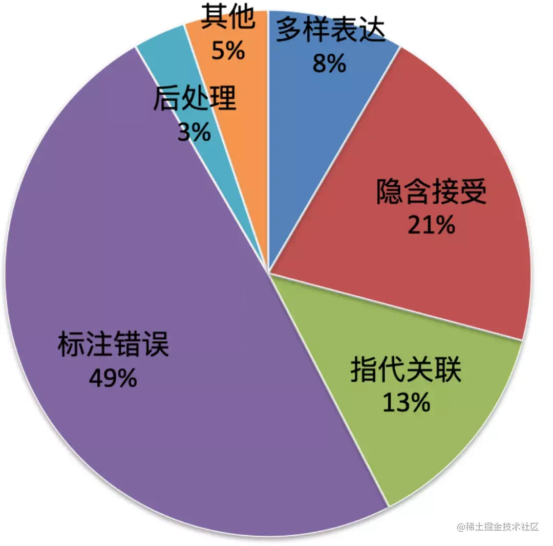 下图3是我们利用目前最好的DST 模型 TripPy[10],在 MultiWOZ2.1数据集上进行错误分析得到的一个错因占比统计。除了标注错误,后处理不当等额外因素,以上三类问题的占比达到约 42%,这需要更好的模型和方案来进行解决。