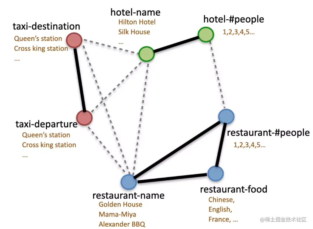 实线连接的是同一个领域下的槽,虚线连接的是不同领域之间可能存在槽值关联的槽,整体形成了一个网络状的结构。每个槽的槽值在不同的自然语句中也会有不同的表达形式,我们希望将这些隐含的联系在预习阶段通过预训练的方式让模型学习出来。