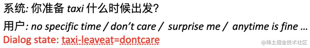 - 真实用户表达丰富多样,增大解析难度。例如,在DST任务中,每个槽有一个特殊的槽值叫 dontcare,用于表示用户对该槽可选取所有值,即没有特定值限制。在 MultiWOZ 数据集中,用户对于 dontcare 的表达多样性很大,十分考验模型的语言理解能力。