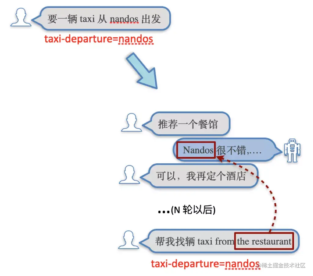 同样是用户想要一辆从 nandos 作为出发地的taxi, 图6中上方的对话例子是一个最简单的表达。而图6中下方的对话例子,尽管DST结果和简单例子一样,却要困难很多,用户是通过”from the restaurant”这种表述间接地表达了需要一辆出发地是nandos餐馆的taxi。