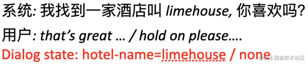- 用户隐含接受系统推荐。例如,当系统推荐某家酒店时,用户针对推荐的结果的态度既可以是正面的表达(that’s great),也可以是非正面的表达(hold on please),对应的hotel-name 槽也就会填或不填。